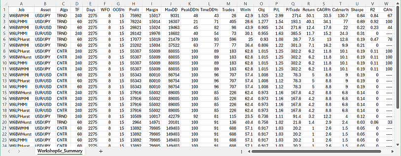 So you can see at a glance which parameter combinations work with which assets and time frames, and which are not worth to examine further. You can repeat this step with different global settings, such as bar period or optimization method, and generate multiple summaries in this way.